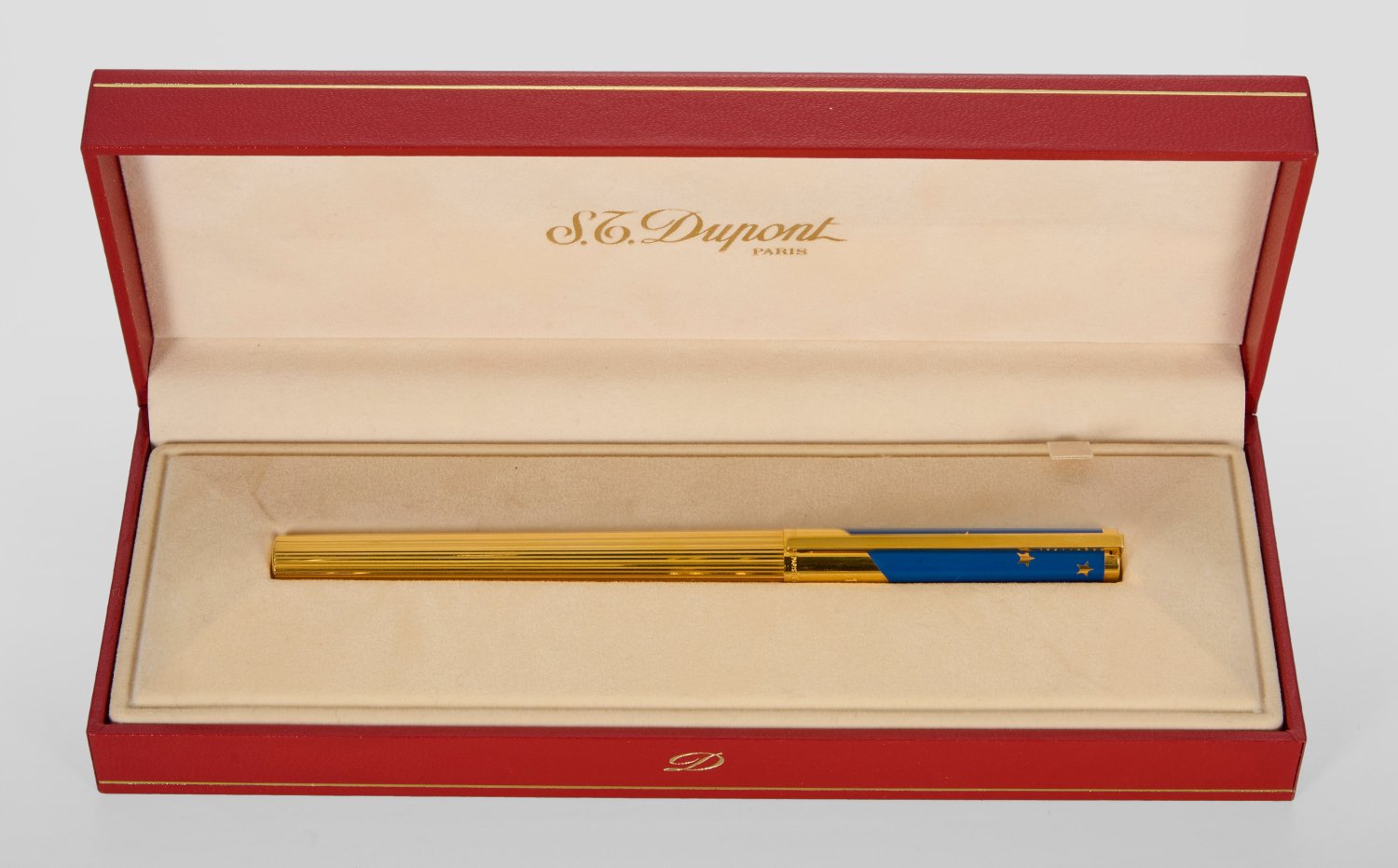 Metall vergoldet. Schlanke, runde Form, abnehmbare Kappe mit Clip. Korpus mit fein guillochiertem Rillendekor, Kappe mit Sternen auf dunkelblauem Grund in Cloisonée-Technik sowie graviertes Datum "1993". Limitierte Auflage 1561/4000, Ref.-Nr. 041785M. Ersatzpatronen, Futteral. Garantiekarte, Originalbox und -Papiere. L. 13,9 cm.