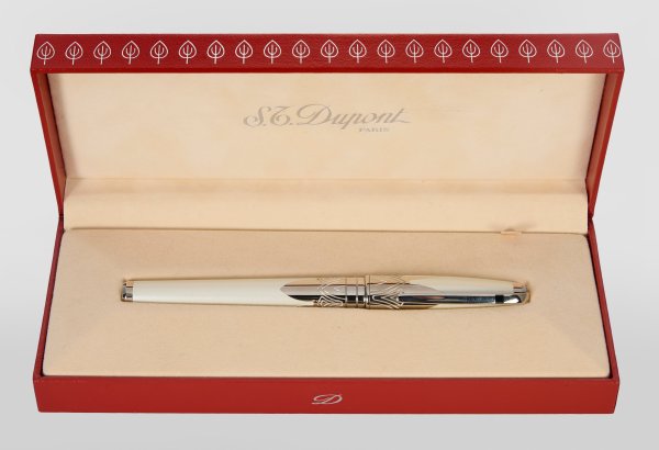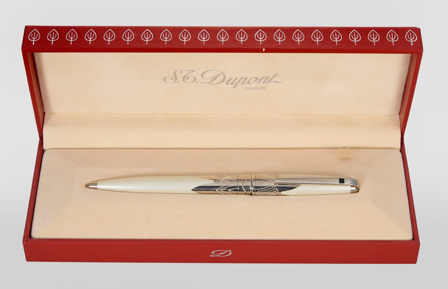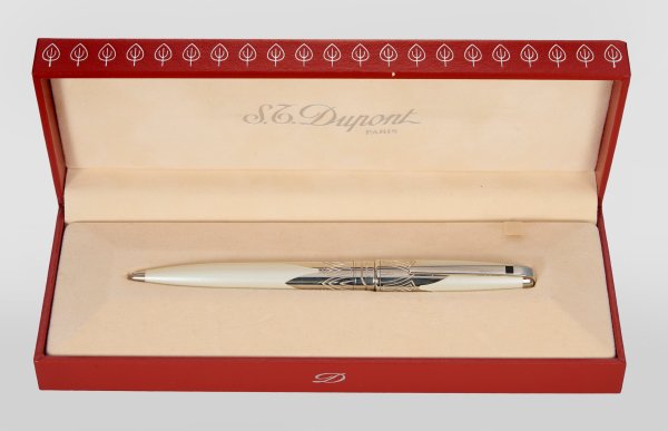 A Vintage Dupont set, with fountain pen and ballpoint pen. Platinum plated metal and mother-of-pearl-coloured Chinese lacquer. 18 k white gold nib, with refills. Manufacturer's mark. Original boxes and papers.