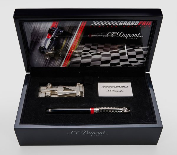 Silberfarbenes Metall, schwarzer und roter China-Lack. Kappe mit Schachbrettmuster und Hersteller-Logo. Feder 14 k Weißgold. Briefbeschwerer aus silberfarbenem Metall in Form eines Formel-1-Rennwagens. Limitierte Auflage 0109/1929. Ref.-Nr. 251680. Ersatzpatronen. Neuwertig. Herstellerzeichen, Originalbox und, -Papiere. L. 9/15,3 cm.