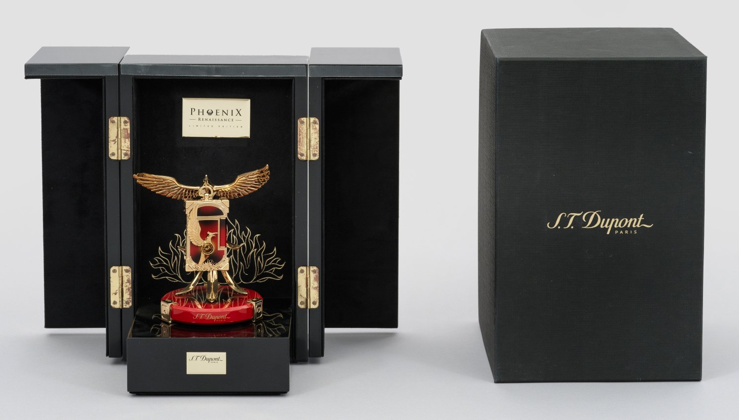 2-tlg.; Metall vergoldet und rot-schwarzer China-Lack. Feuerzeug schauseitig mit zentral facettiertem Citrin, Phönix-Motiv und Ringaufhängung, Halterung in stilisierter Form eines Phönix. Futteral. Limitierte Auflage 015/388. Herstellerzeichen. Originalbox und -Papiere. H. 7/14,5 cm.