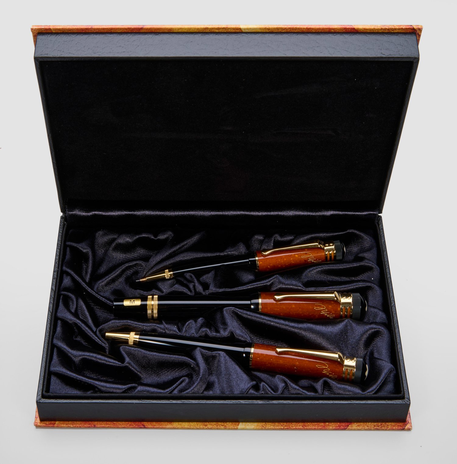 A Vintage Montblanc Master Writers Edition set, with fountain pen, mechanical pencil, ballpoint pen. Black precious resin, amber, gilt metal. 18 k gold nib, size M. Manufacturer's mark. Original box and papers.