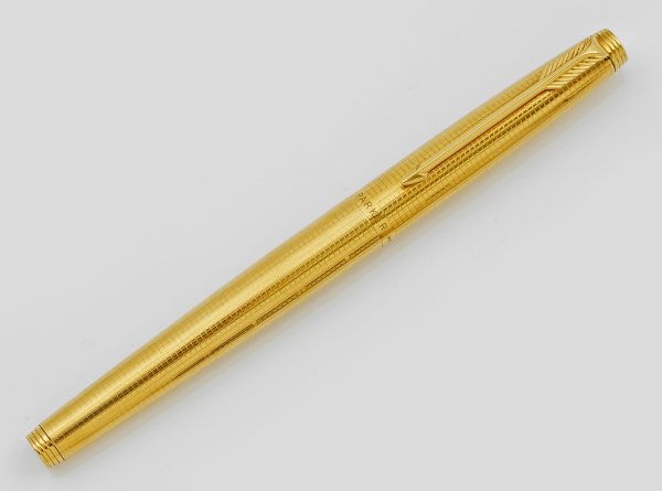 14 k vergoldet und schwarzer Kunstharz. Konischer, flächendeckend mit feinem Gitterwerk reliefierter Korpus für Patronenfüllung. Goldfeder. Herstellerzeichen sowie 14K.G.F.; L. 12,8 cm.