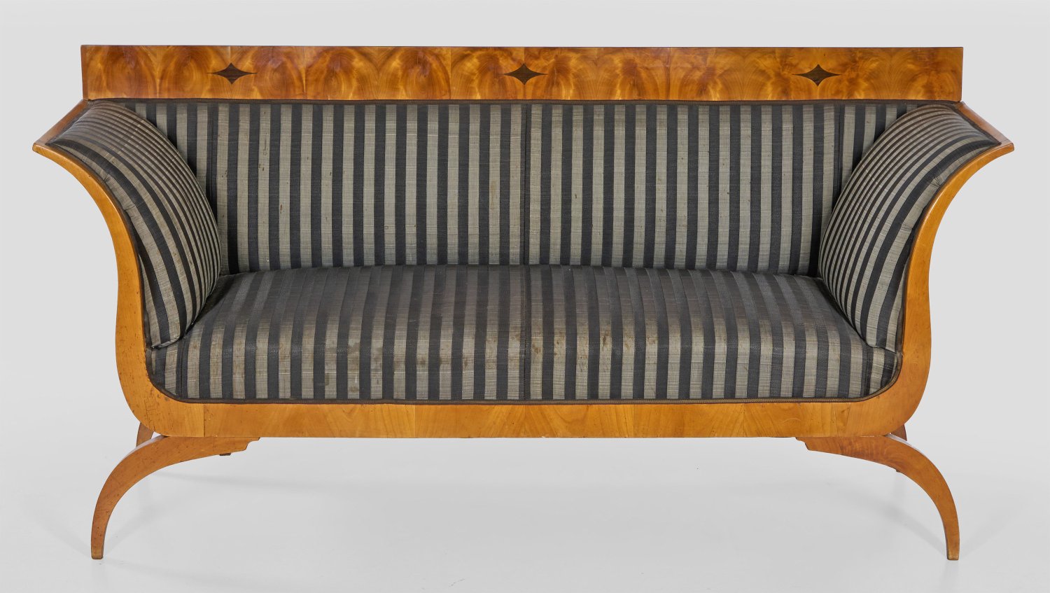 Kirschbaum, massiv und furniert sowie teilw. ebonisiert. Gerade Zarge auf gebogten, spitz zulaufenden Beinen. Schlanke, weit ausschwingende Armlehnen sowie gerade Rückenlehnenrahmung mit breitem oberen Abschluss. Gepolstert und allseitig mit gestreiftem Rosshaar bezogen. H. 95,5 cm 191 cm x 58 cm. Sitz-H. 45 cm.