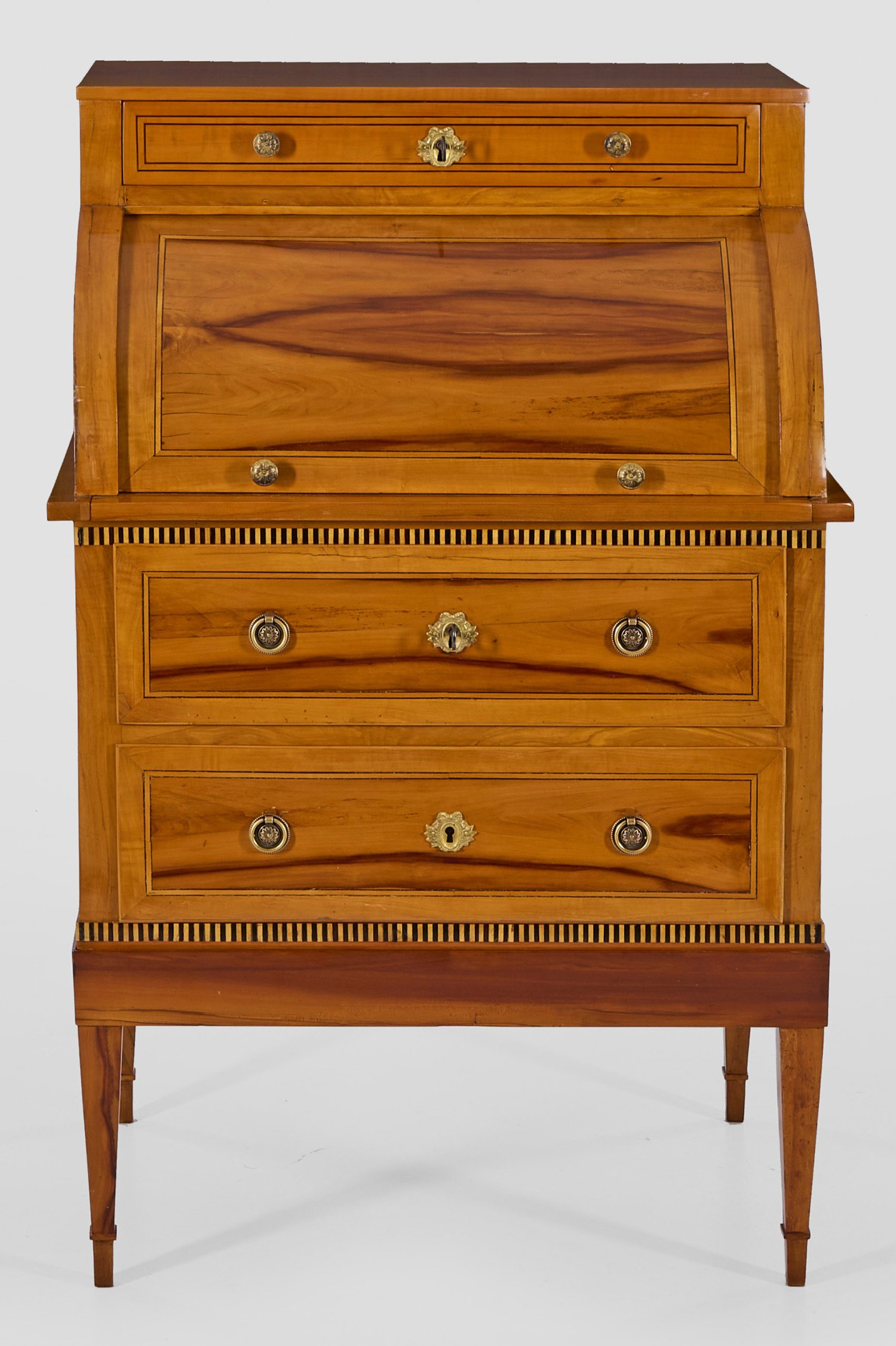 Apfelholz, furniert. Über gerader Zarge und konischen Vierkantbeinen rechteckig angelegter Korpus. In der gegliederten Front zwei Schubladen sowie bombierter Zylinderverschluss mit ausziehbarer Arbeitsfläche. Innen gestaffelte Facheinteilung. Einschübiger oberer Abschluss. H. 116 cm. 75 cm x 50 cm.