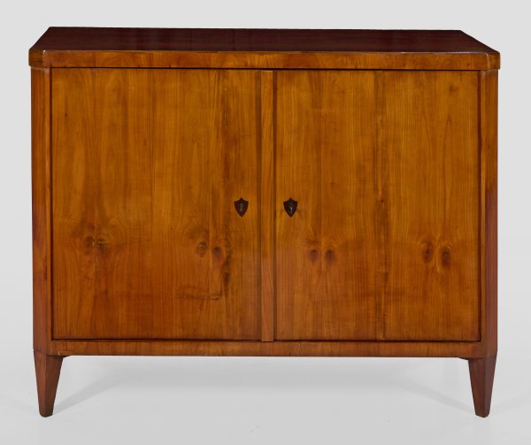 Kirschbaum, furniert. Gerader, querrechteckig angelegter Korpus, flankiert von schmalen, schräggestellten Ecklisenen auf konischen Vierkantbeinen. In der gegliederten Front zwei große Türen. Korrespondierende, gering überstehende Deckplatte. H. 98,5 cm 128 cm x 54 cm.