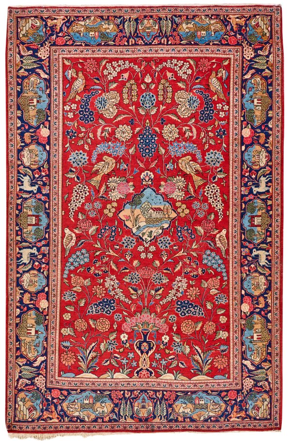 Persien. 1930er Jahre. Wolle auf Baumwolle. Im hellroten Innenfeld kleines Rautenmedaillon mit Landschaftsdarstellung. Flächendeckende Musterung aus großen Blütendolden und Vögeln. Umlaufend blaugrundige Rahmung aus Architekturkartuschen, Blüten und Wildtieren. 204 cm x 134 cm.