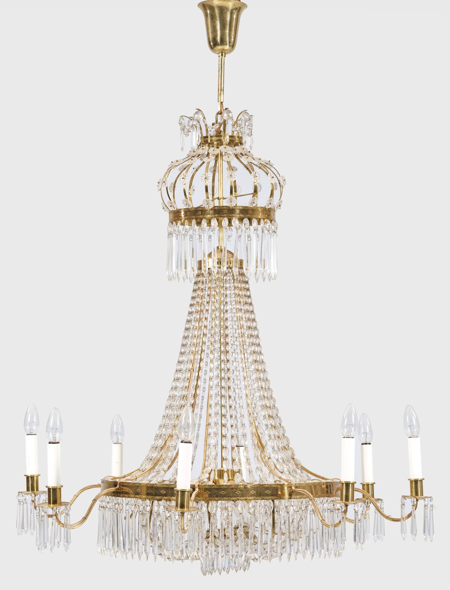 8-flg.; Messing und farbloses Kristallglas. Balusterförmiger Korpus aus Prismenschüren im Verlauf. In der Mitte schmaler Reif als Träger für geschweifte Leuchterarme mit zylinderförmigen Tüllen. Kuppelförmiger oberer Abschluss mit Blütenrosetten. Behang aus gestreckten, facettierten Prismen. Innen vier Lampenfassungen, elektrifiziert. H. 123 cm. D. 90 cm.