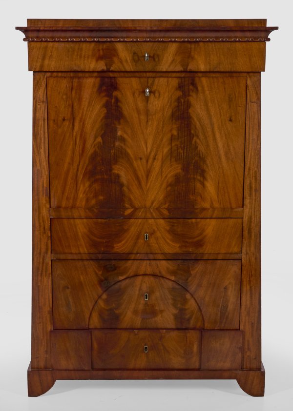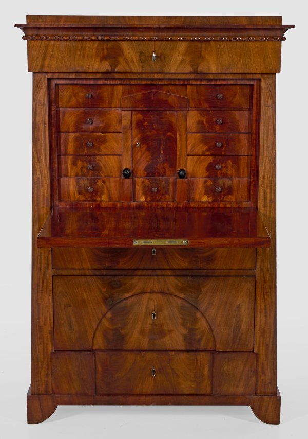 Mahagoni, furniert. Hochrechteckiger, pyramidal angelegter Korpus auf gerundeten Füßen. In der gegliederten Front vier teilw. durch zurückgesetzten Segmentbogen verbundene Schubladen unterschiedlicher Größe sowie abklappbare Arbeitsfläche. Dahinter architektonisch gegliederte, gestaffelte Facheinteilung. Gestuft ansteigende Deckplatte mit Kehlprofil und Perlstabfries. Innen handschriftliches Etikett "Schenna brda Jüvarade Lady Gosling sina seuychen". H. 139 cm. 90 cm x 54,5 cm.