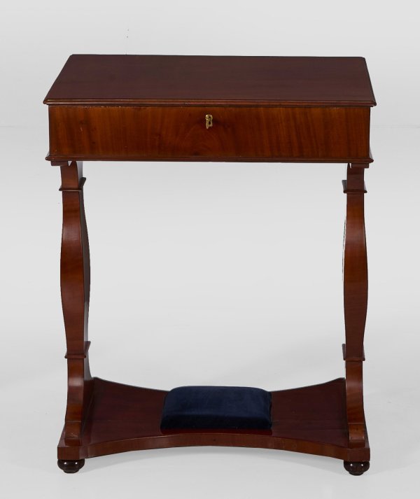 Mahagoni, furniert. Über konkav eingezogener Sockelpatte mit gepolsterter Fußauflage, balusterförmige Seitenwangen als Träger für rechteckigen, umlaufend profilierten Zargenkasten. Korrespondierende, aufklappbare Deckplatte. Unterhalb gestaffelte Facheinteilung. H. 73,5 cm. 60 cm x 42 cm.