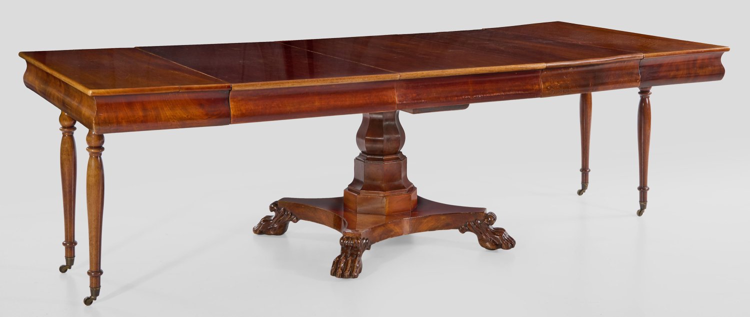 Mahagoni, furniert. Über konkav eingezogener Sockelplatte auf plastischen Tatzenfüßen mehrfach gegliederter, gekanteter Balusterschaft als Träger für gerundete Zarge und gering überstehende Deckplatte. Dazu drei unterschiedlich breite Einlegeplatten mit Zarge und zwei ohne. Erg.; H. 76 cm. 110 cm x 87/250/400 cm.