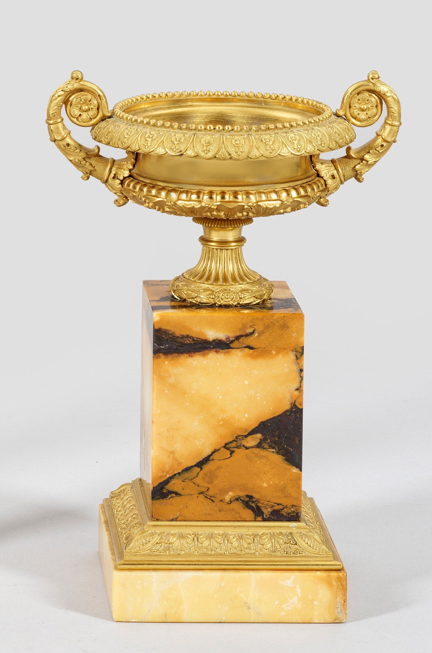 Bronze, vergoldet sowie karamellfarbener, bordeauxrot und weiß gemaserter Marmor. Über quadratischer Plinthe mit umlaufendem Palmettenfries hoher, gekanteter Sockel. Oberhalb davon ausgehend vasenförmiger Schalenaufsatz mit plastisch gestaltetem Akanthusblatt und weit ausschwingendem Lippenrand. Seitlich stark geschwungene Henkel aus eingerollten Voluten. H. 28 cm.