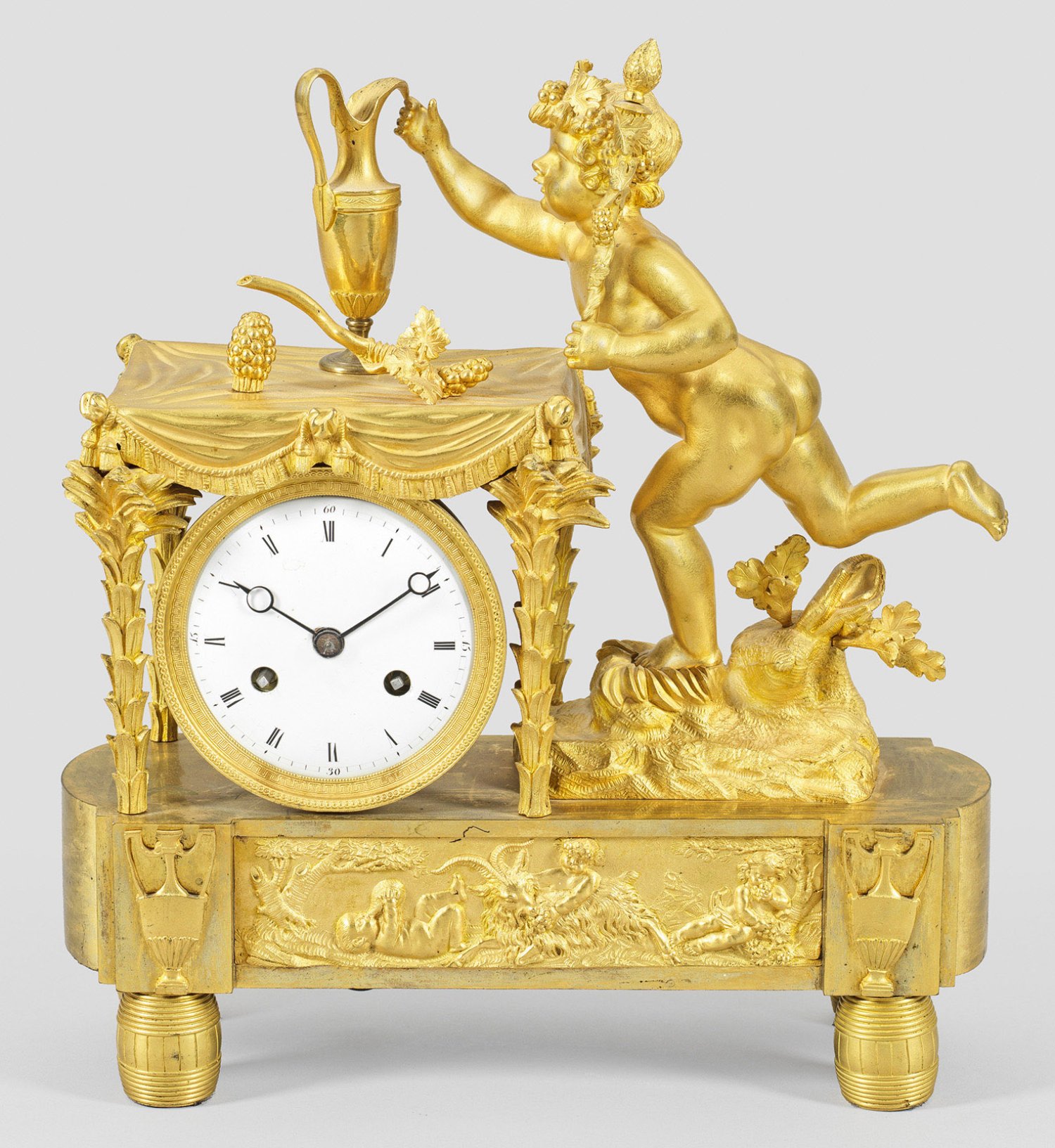 Bronze, feuervergoldet. Über querrechteckig angelegtem Sockel mit breitem Relieffries aus Bacchantenkindern, auf gerundeten Füßen in Form von Weinfässern, vollplastische Darstellung einen Bacchantenknaben mit Schenkkanne, Profilgerahmtes Uhrengehäuse mit minim. besch. Emailzifferblatt. Pendulenwerk mit Fadenaufhängung sowie Halbstundenschlag auf Glocke. H. 32,5 cm. 28 cm x 10 cm.