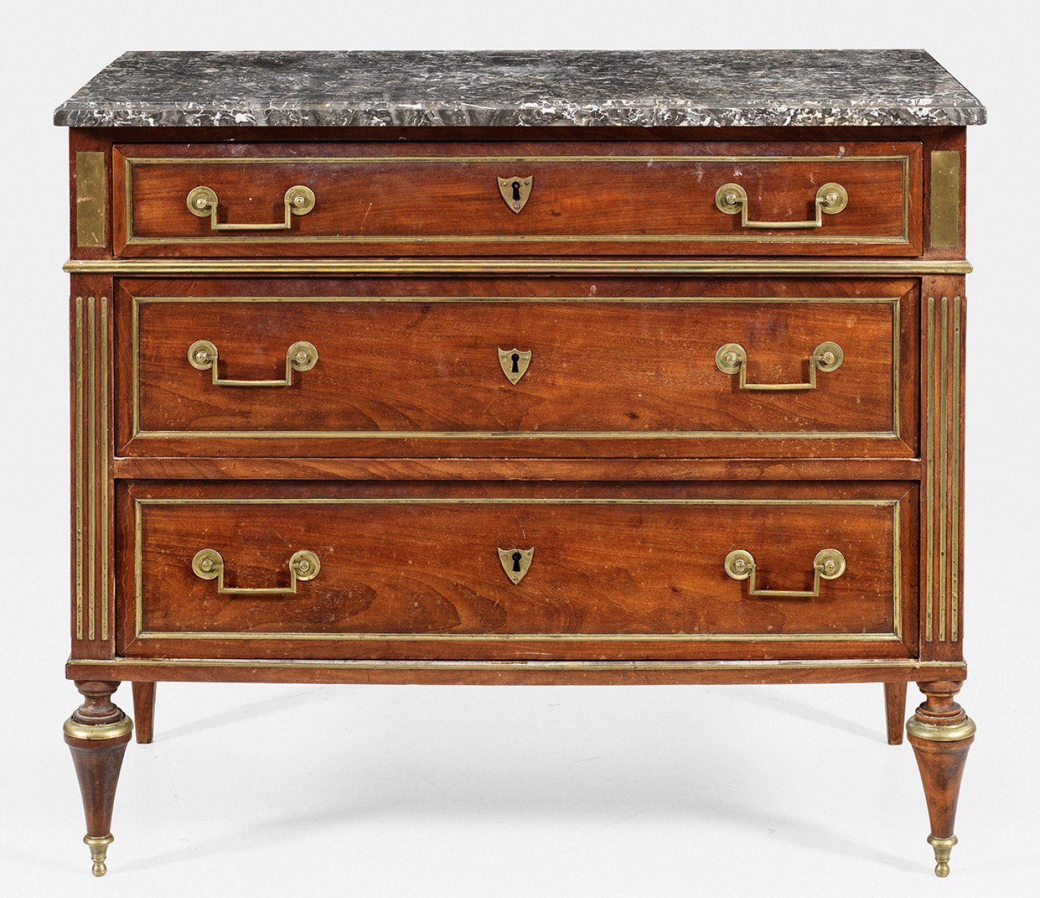 Mahagoni, furniert sowie Profile und Einlagen aus Messing. Gerader, querrechteckig angelegter Korpus, flankiert von Pilastern mit godronierten Streben auf spitz zulaufenden Balusterbeinen. In der gegliederten Front drei profilierte Schubladen unterschiedlicher Größe. Gering überstehende Deckplatte aus dunkelgrauem, weiß gemasertem Marmor. H. 84 cm. 95,5 cm x 48 cm.