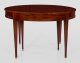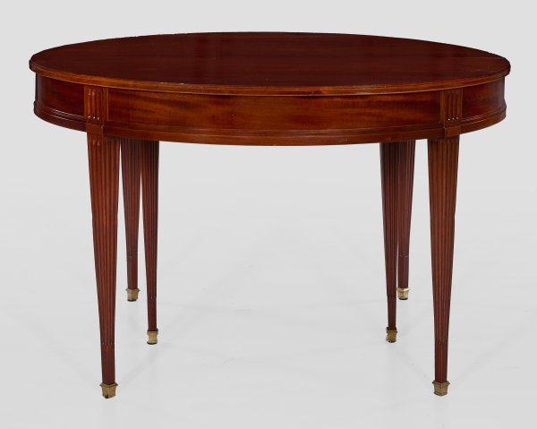 Mahagoni, massiv und furniert. Bombierte, profilierte Zarge auf konischen, kannelierten Vierkantbeinen mit Messingkappen. Gering überstehende Deckplatte. Dazu zwei erg. Einsteckplatten. H. 79 cm. 132 cm x 120/242 cm.