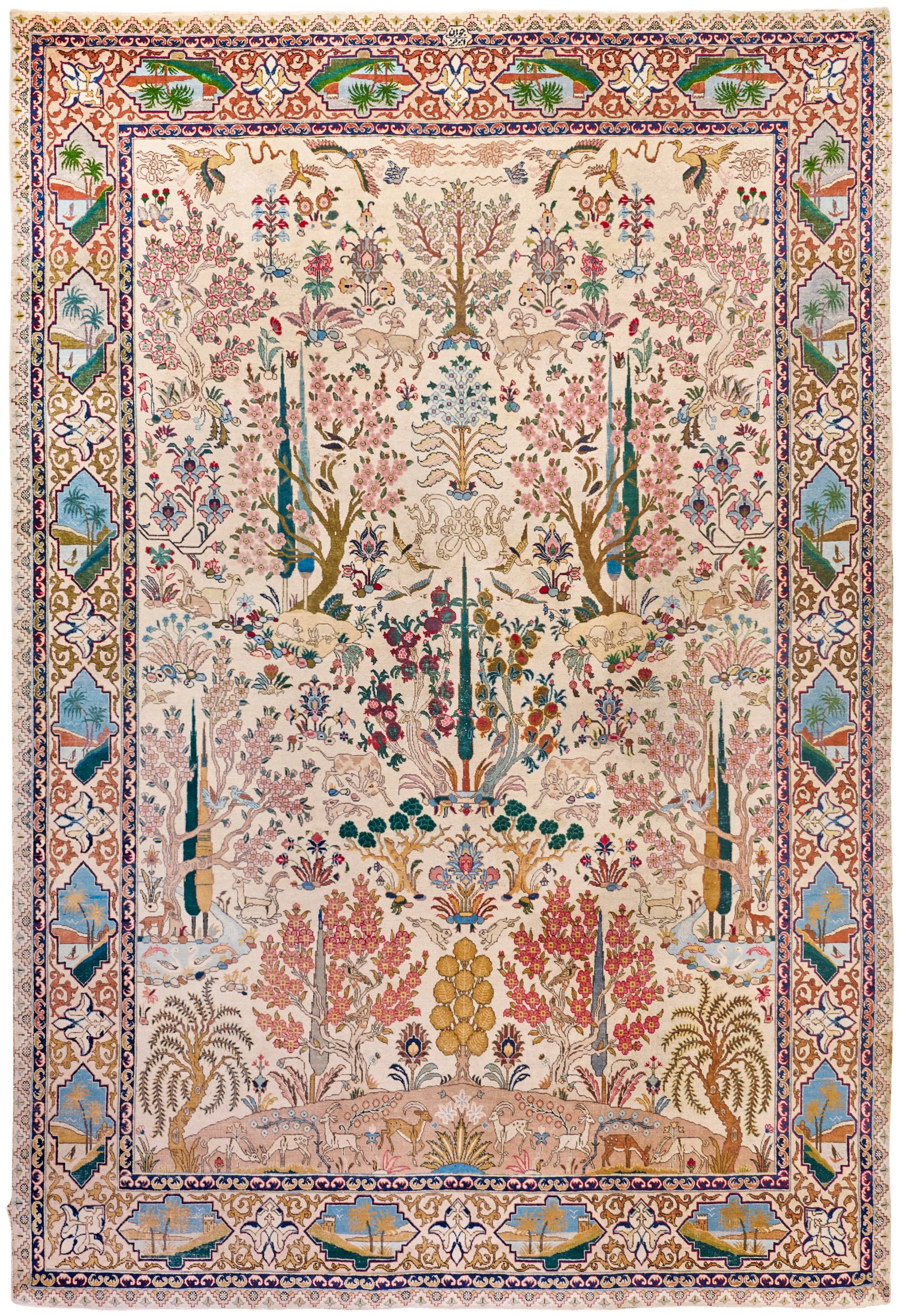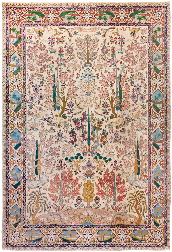 Persien. Mitte 20. Jh.; Wolle auf Baumwolle. Im elfenbeinfarbenen Innenfeld flächendeckende Paradiesgartenmusterung aus üppigen Blütenzweigen, unterschiedlichen Wildtieren und Vögeln. Umlaufend breite Hauptbordüre aus Kartuschen und Rankenwerk, flankiert von schmalen Bändern. Sign.; 420 cm x 275 cm.