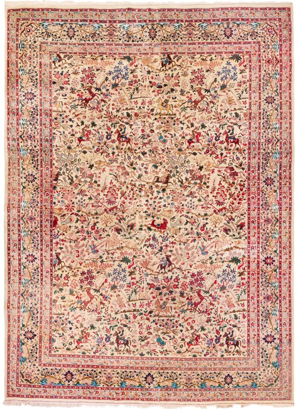 Persien. Um 1950. Wolle auf Baumwolle. Im elfenbeinfarbenen Innenfeld flächendeckend, dichte Musterung mit unterschiedlichen Jagdszenerien und Blütenzweigen. Umlaufend breite, korrespondierende Bordüre, flankiert von schmalen Bändern. Rest.; 400 cm x 290 cm.