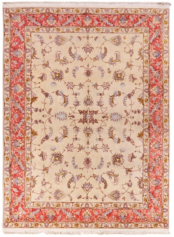 Persien. Wolle mit Seide auf Baumwolle. Feine Knüpfung. Im cremefarbenen Innenfeld flächendeckende Musterung aus filigranen, arabesk angeordneten Blattranken. Umlaufend breite, hellrote Palmettenbordüre, begrenzt von schmalen Bändern. 197 cm x 149 cm.