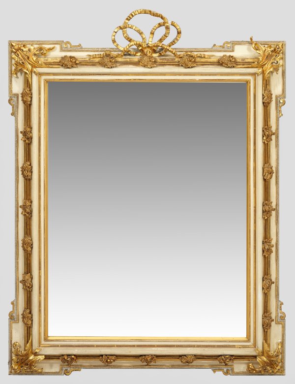 Holz, stuckiert, elfenbeinfarben gefasst und teilw. vergoldet. Hochrechteckige, stark profilierte Spiegelrahmung mit verkröpften Ecken, plastischem Akanthusblatt und gereihten Blütenmotiven. Große Schleifenbekrönung. 143 cm x 110 cm.