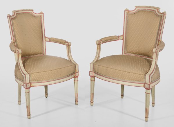 Holz, cremefarben gefasst und roséfarben akzentuiert. Bombierte, profilierte Zarge auf schlanken, kannelierten Balusterbeinen. Stark gebogte Stützen für schmale Armlehnen. Schildförmige, leicht gewölbte Rückenlehne mit geschweift ansteigendem oberen Abschluss. Allseitig gepolstert und bezogen. H. 91 cm. 57 cm x 46 cm. Sitz-H. 45 cm.