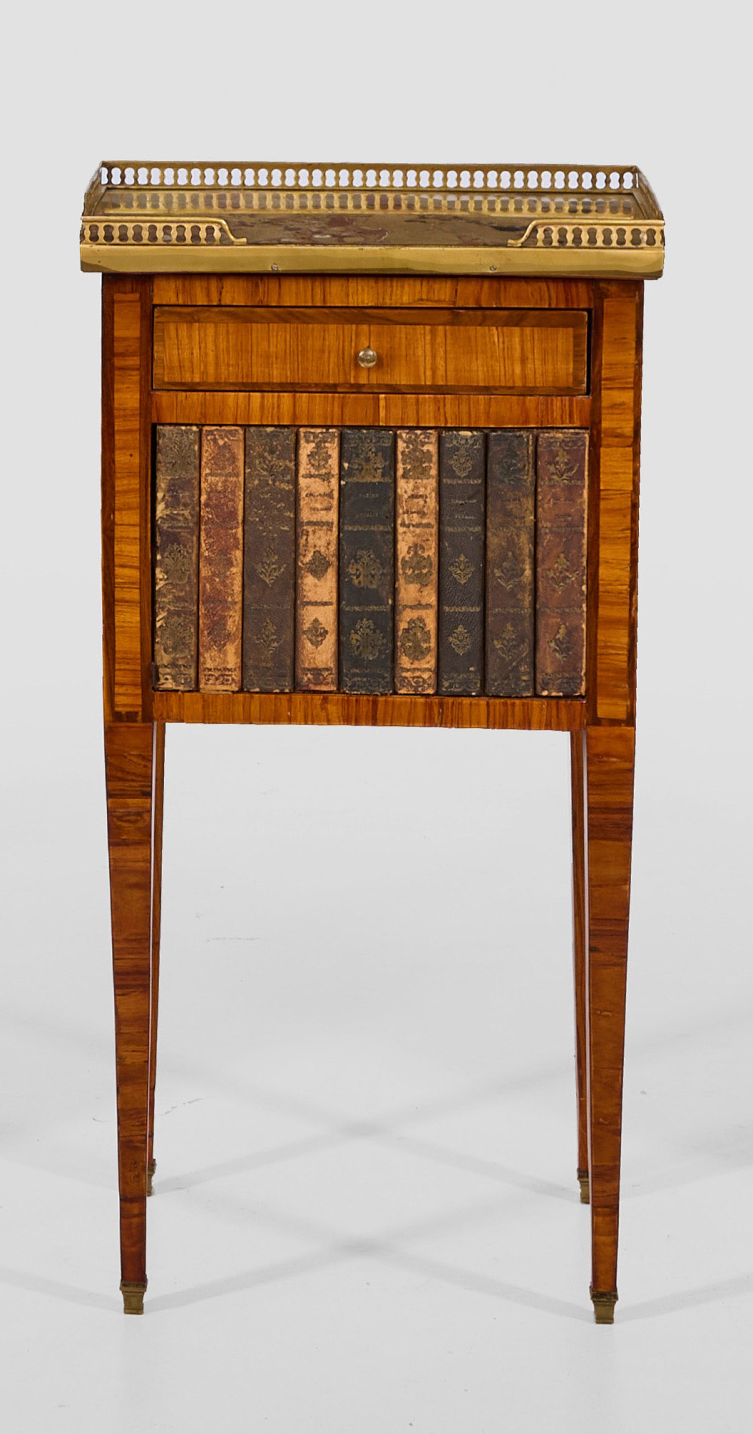 Rosenholz und Nussbaum, furniert. Gerader, hochrechteckiger Korpus auf konischen Vierkantbeinen. In der gegliederten Front mit ledergeprägten Buchrücken belegte Tür sowie kleines Schubfach. Gering überstehende Deckplatte aus beigefarben gemasertem, sog. Breche d'Alep Marmor mit durchbrochen gearbeiteter Galerierahmung, rest.; H. 77 cm. 39 cm x 28 cm.