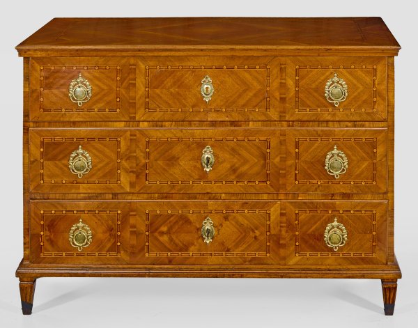 Nussbaum, furniert. Gerader, querrechteckig angelegter Korpus auf schmaler Zarge und kannelierten Balusterfüßen. In der gegliederten Front drei breite Schubladen. Gering überstehende, profilierte Deckplatte. Flächendeckend breit gerahmte, gespiegelt angeordnete Furnierfelder, von ornamentierten Bandeinlagen begrenzt. H. 96 cm. 133,5 cm x 67 cm.
