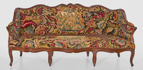 Nussbaum. Passig geschweifte Zarge auf geschwungenen Volutenbeinen. Geschweifte Stützen für schmale Armlehnen, in korrespondierende, hochaufgeworfene Rückenlehne übergehend. Gepolstert und schauseitig flächendeckend mit Petit bzw. Gros-Point-Stickerei bezogen. In der Mitte große Reserve mit mythologischer Szenerie, umgeben von üppigem, stilisierten Blütenwerk. H. 100 cm. 220 cm x 80 cm. Sitz-H. 43 cm