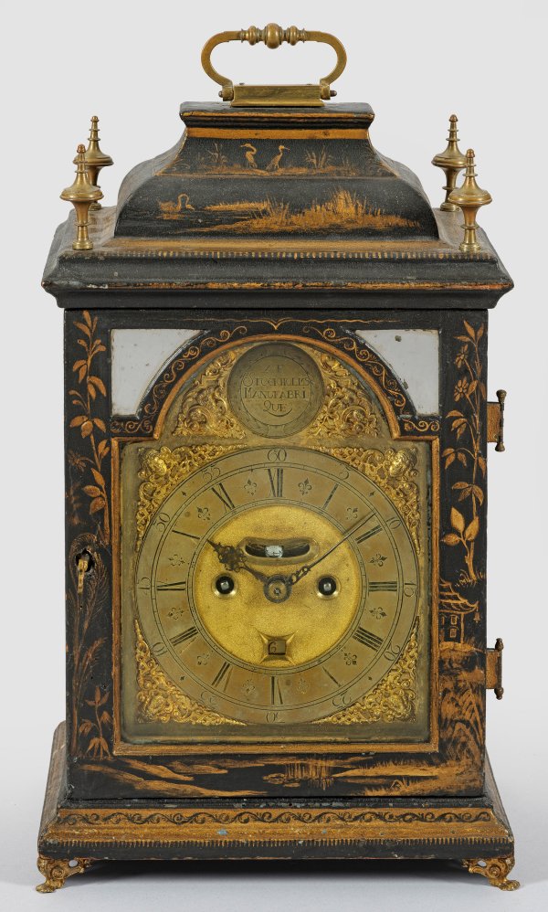 Flächendeckender Fond aus Schwarzlack mit Golddekor. Gerader, hochrechteckiger, allseitig verglaster Korpus auf schmaler Zarge und Volutenfüßen. Geschweift ansteigender oberer Abschluss mit aufstellbarem Griff. Reliefiertes Zifferblatt mit Datumsanzeige bez. AF Stockholms Manufabrique. Werk mit Spindelhemmung sowie Stundenschlag auf Glocke. Dekorativ reliefierte Platine dito bez.; Flächendeckender erg. Chinoiseriedekor. H. 49 cm. 27 cm x 18 cm.