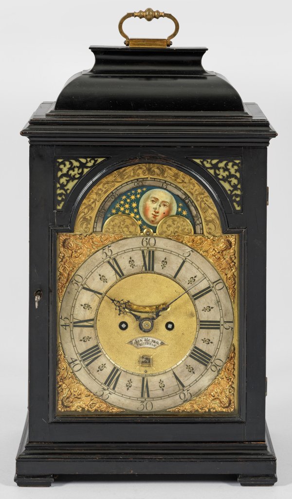 Holz, ebonisiert. Gerader, hochrechteckiger, allseitig verglaster Korpus auf schmalem Profilsockel. Geschweift ansteigender oberer Abschluss mit aufstellbarem Bügel. Erhaben reliefiertes Zifferblatt mit aufgelegtem Ziffernring, bez. Jan Heyer Amsterdam. Datumsanzeige und Mondphase. Werk mit Spindelhemmung, Halbstundenschlag auf zwei Glocken. H. 57 cm. 31 cm x 19,5 cm.