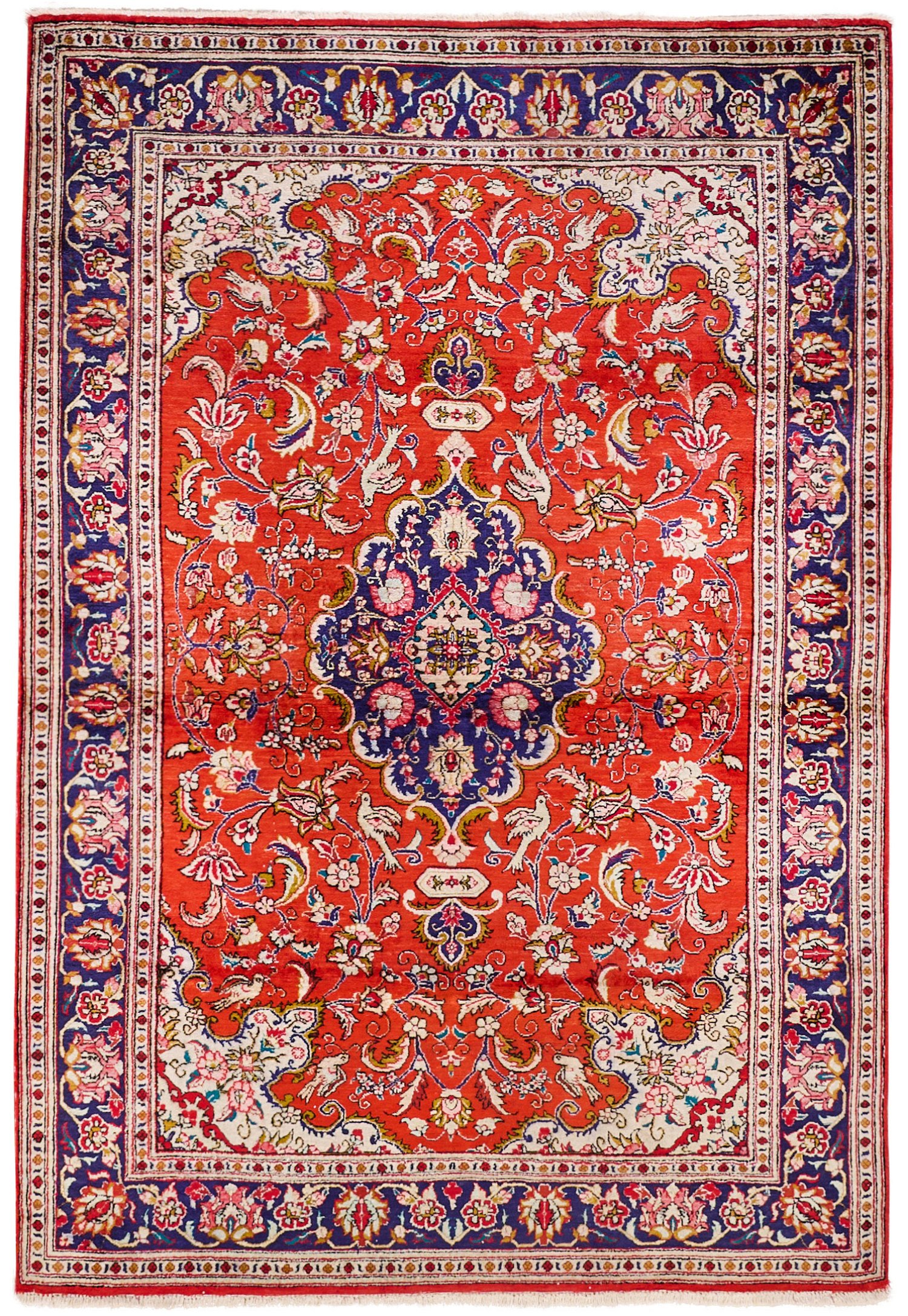 Persien. Seide auf Seide. Feine Knüpfung. Im roten Innenfeld großes, tintenblaues Zentralmedaillon sowie passig geschweifte, elfenbeinfarbene Ecklösungen. Flächendeckende Musterung aus Rankenwerk. Umlaufend breite, blaugrundige Palmettenbordüre. 144 cm x 100 cm.