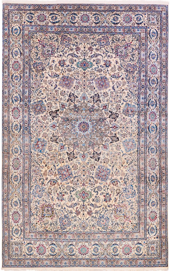 Persien. Wolle mit Seide auf Baumwolle. Im elfenbeinfarbenen Innenfeld großes, zentrales Rundmedaillon mit Anhängern sowie passig geschweifte Ecklösungen. Flächendeckend dichte Musterung aus Palmettenranken. Umlaufend korrespondierende Bordüre in entsprechender Farbigkeit. 311 cm x 486 cm.