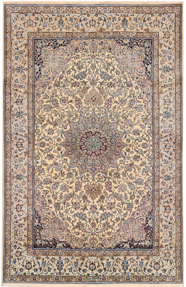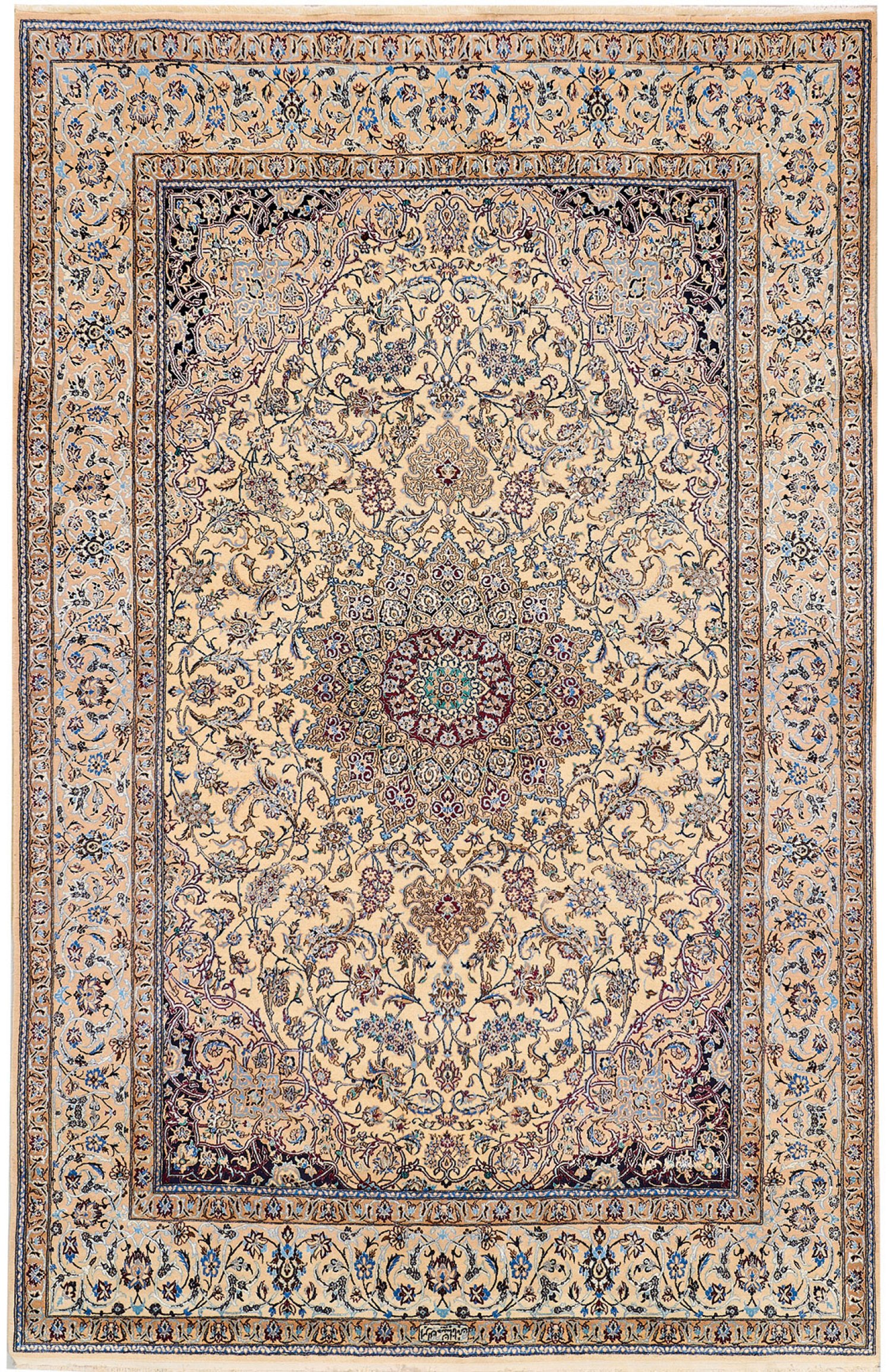 Persien. Korkwolle mit Seide auf Baumwolle. Feine Knüpfung. Im cremefarbenen Innenfeld großes Zentralmedaillon mit Anhängern sowie passig geschweifte Ecklösungen. Flächendeckend dichte Musterung aus Blattranken. Umlaufend breite Bordüre aus Palmettenranken, flankiert von schmalen Bändern. Sign.; 260 cm x 173 cm.