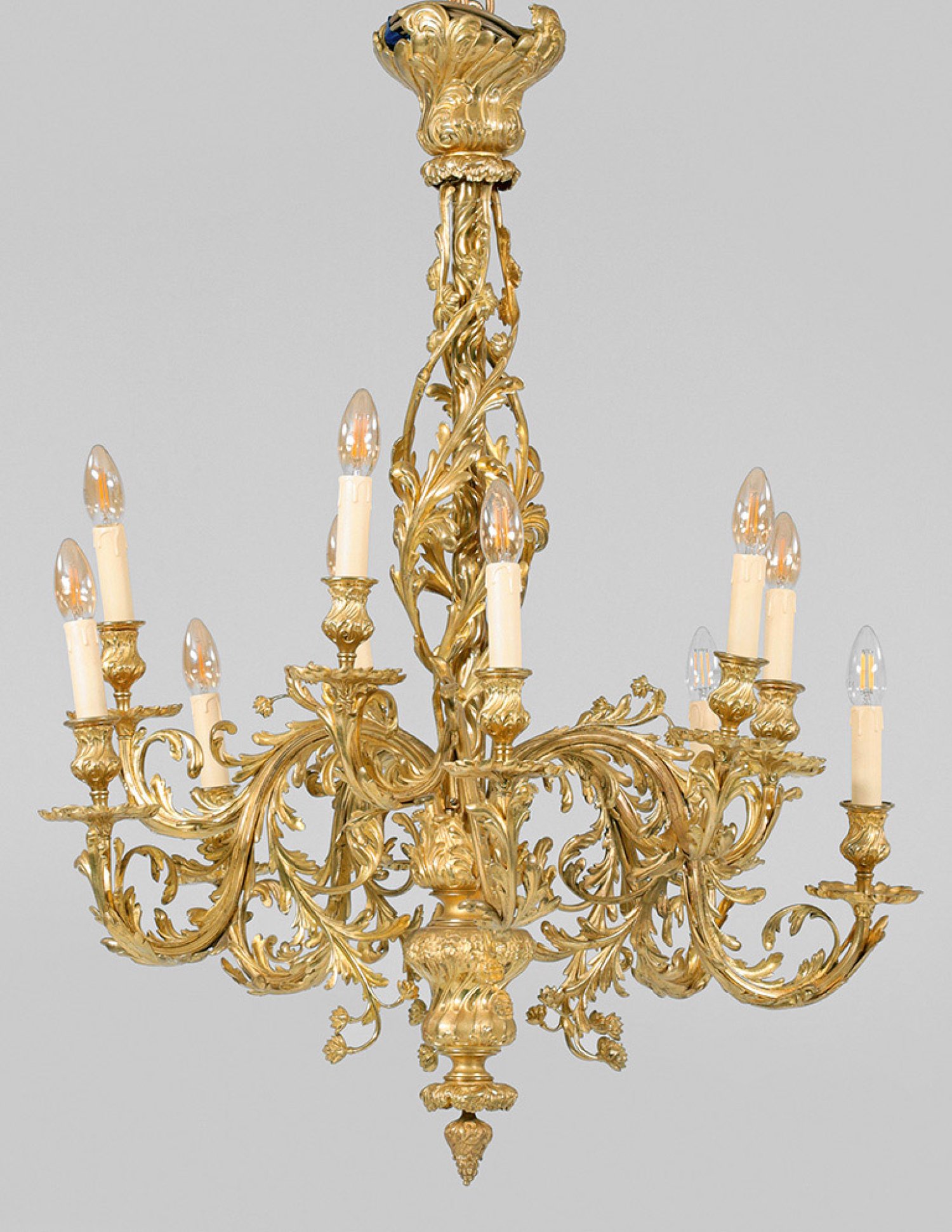 10-flg.; Bronze, vergoldet. Durchbrochen gestalteter, balusterförmiger Schaft aus gedreht angeordneten Blattranken. Unterhalb davon ausgehend fünf stark geschwungene Leuchterarme aus üppigen, eingerollten Blattvoluten als Träger für paarweise und gestuft angeordnete Leuchtmittel mit vasenförmigen Tüllen. Elektrifiziert. H. 100 cm. D. 76 cm.
