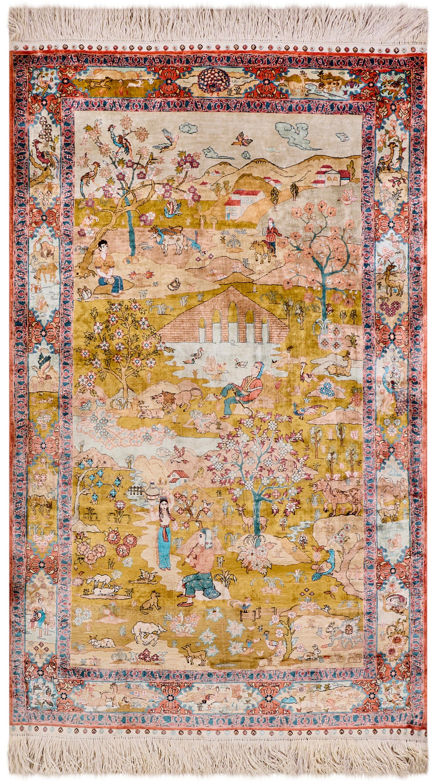 Seide auf Seide. Feine Knüpfung. Im Innenfeld flächendeckende, szenisch angelegte Landschaftsdarstellung mit Hügeln, Häusern, Gewässern sowie unterschiedlichen Blüten und Vögeln. Umlaufend breite, rotgrundige Bordüre aus korrespondierenden Kartuschen, begrenzt von schmalen Bändern. 153 cm x 94 cm.
