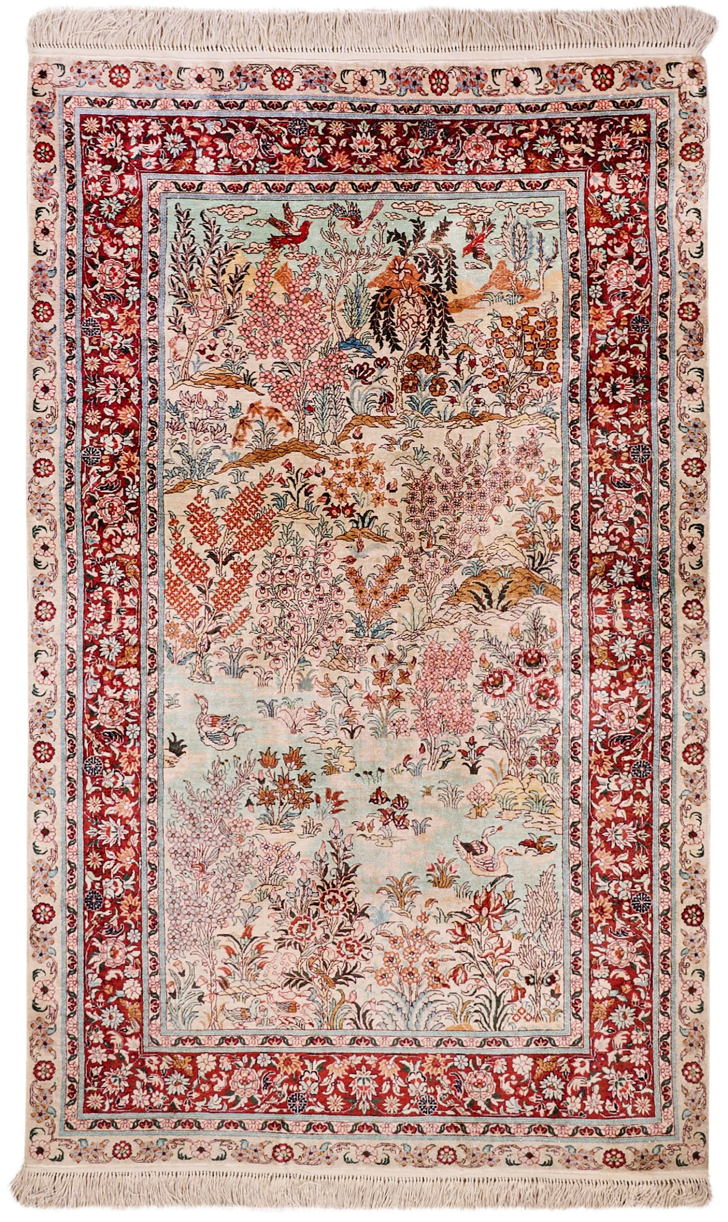 Seide auf Seide. Feine Knüpfung. Im elfenbeinfarbenen Innenfeld flächendeckende Paradiesgartenmusterung mit Flusslauf, üppigen Blütenrispen und -dolden sowie Enten und anderen Wildvögeln. Umlaufend breite, rotgrundige Blütenbordüre, begrenzt von schmalen Bändern. 154 cm x 94 cm.