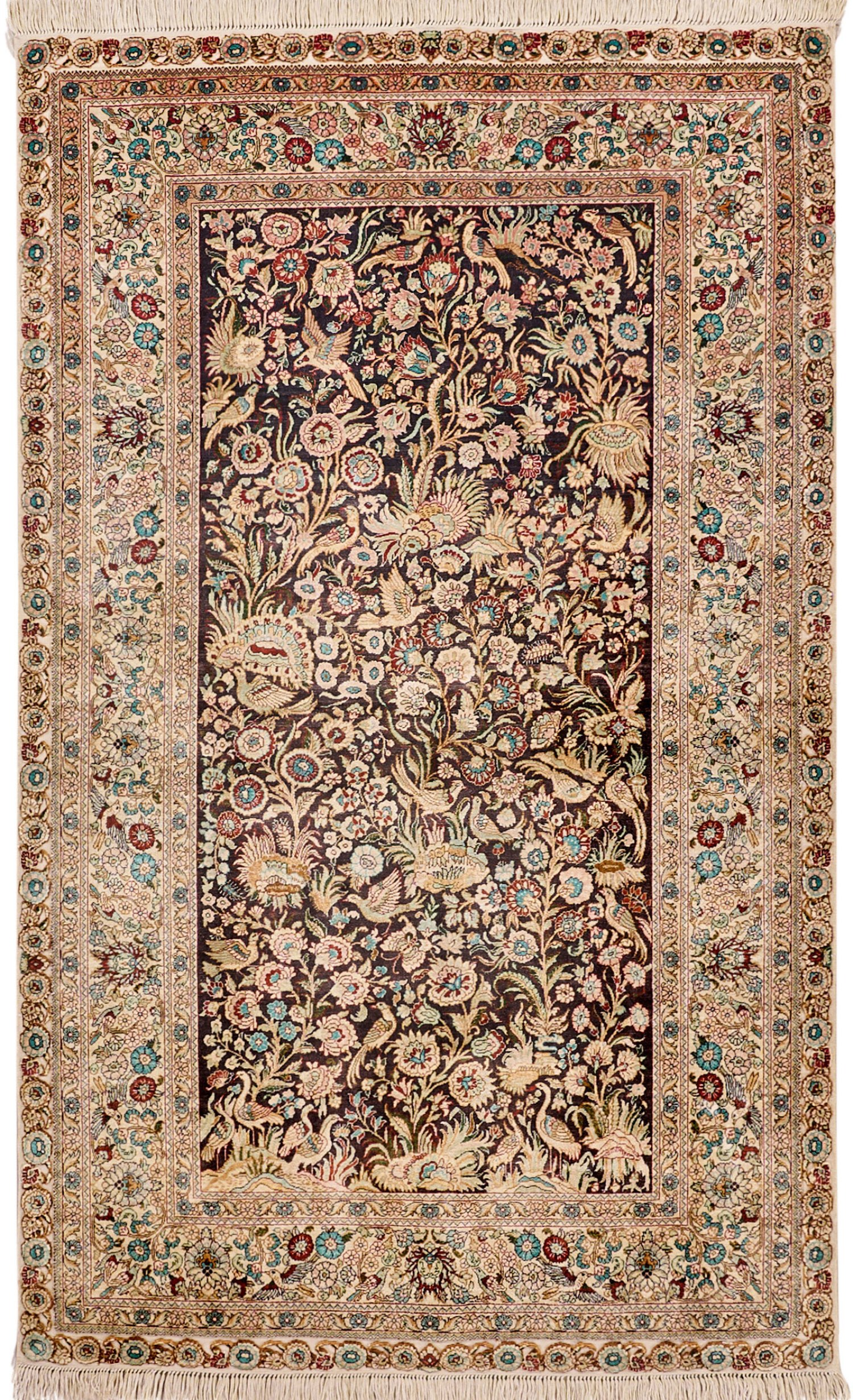 Seide auf Seide. Feine Knüpfung. Im dunklen Innenfeld flächendeckende Paradiesgartenmusterung mit üppigen, dicht angeordneten Blütenranken und unterschiedlichen Vögeln. Umlaufend breite, elfenbeinfarbene Blütenbordüre, flankiert von schmalen Bändern. 151 cm x 93 cm.