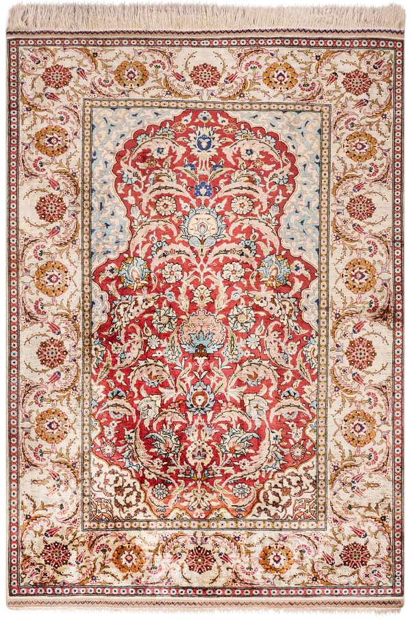 Türkei. Seide auf Seide. Im hellroten Innenfeld passig geschweifte Gebetsnische mit flächendeckender Musterung aus Blattranken. Umlaufend breite, elfenbeinfarbene Hauptbordüre aus großen Rosetten und Lanzettblättern, begrenzt von schmalen Bändern. 128 cm x 89 cm.