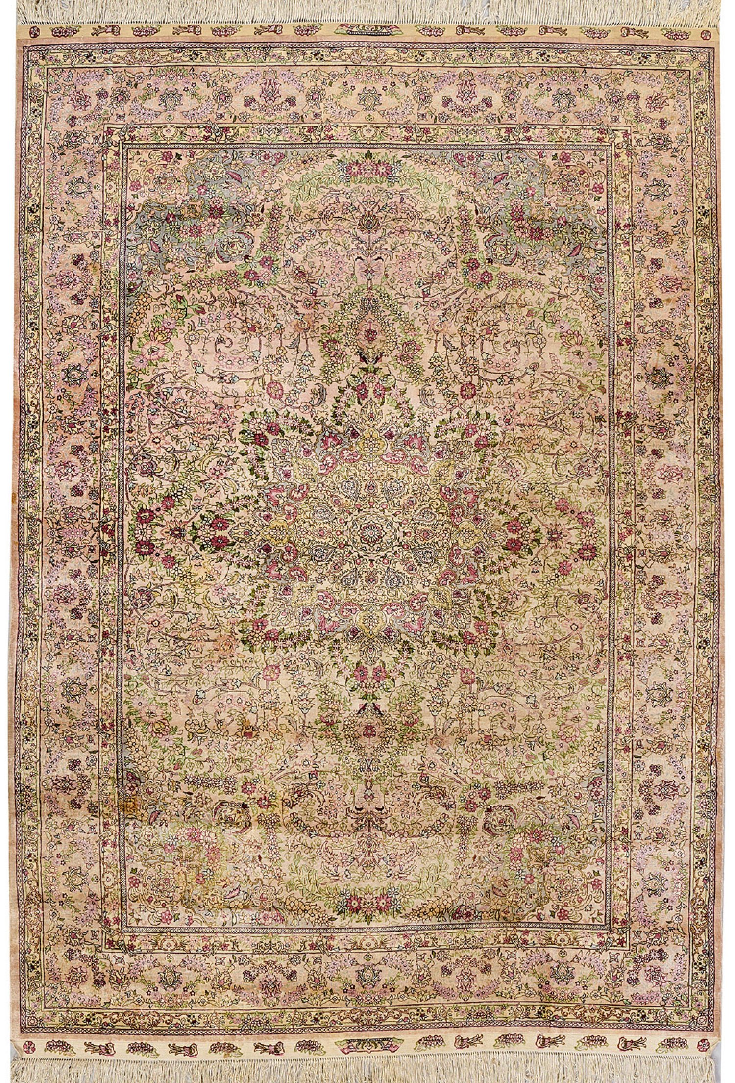 Seide auf Seide. Sehr feine Knüpfung. Im cremefarbenen Innenfeld offen gestaltetes Zentralmedaillon sowie flächendeckend dichte Musterung aus arabesk angeordneten Blütenranken in zarten Pastelltönen. Umlaufend breite, korrespondierende Bordüre. 178 cm x 126 cm.