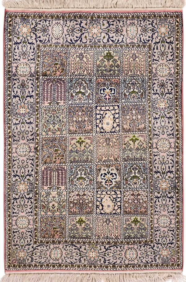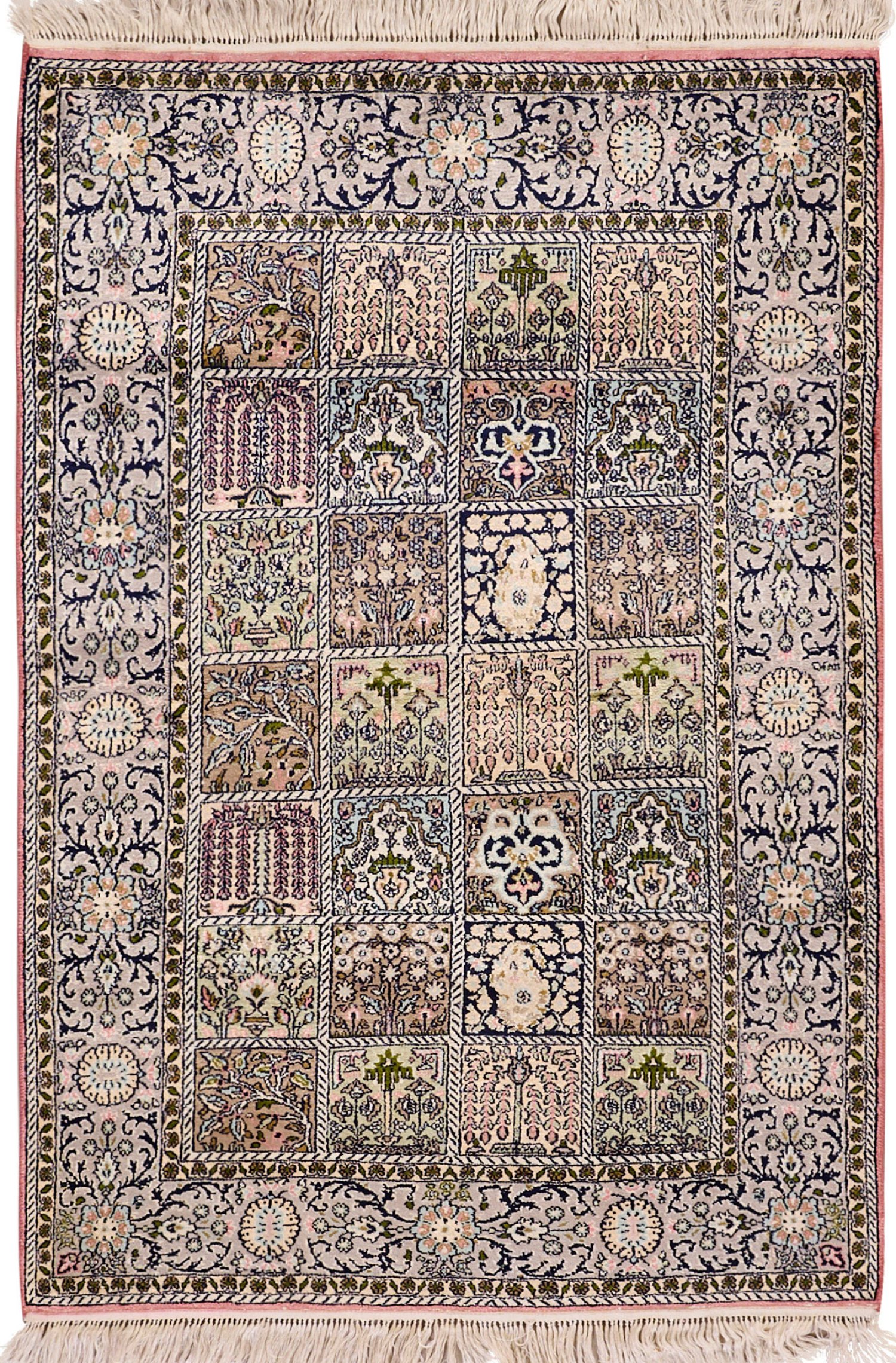 Indien. Seide auf Seide. Im Innenfeld flächendeckende Feldermusterung in Pastelltönen, begrenzt von schmalen Bändern. Umlaufend breite Bordüre aus Palmetten und Rankenwerk. 133 cm x 87 cm.