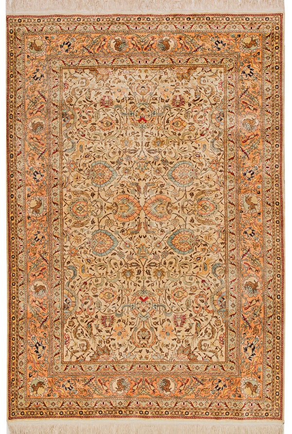 Türkei. Mercerisierte Baumwolle auf Baumwolle. Im cremefarbenen Innenfeld flächendeckend dichte Musterung aus arabesk angelegten Palmettenranken in zarten Pastelltönen. Umlaufend hellorangegrundige Bordüre mit Reserven aus Wildtieren, flankiert von Nebenbordüren. 178 cm x 125 cm.