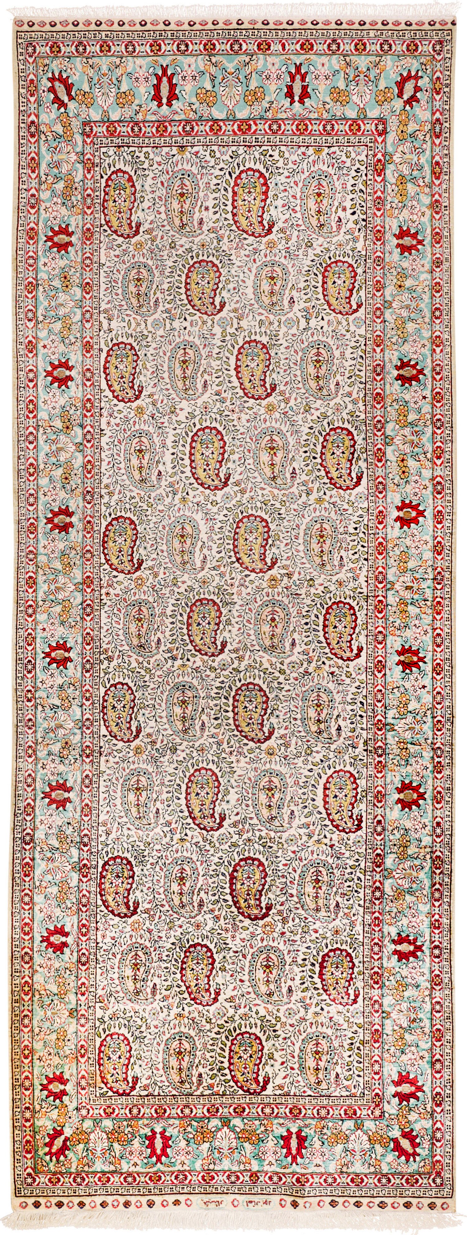 Türkei. Istanbul. Seide auf Seide mit Metallbroschur. Im elfenbeinfarbenen Innenfeld flächendeckende Musterung aus dicht angeordnetem Rankenwerk sowie großen Bothéblüten im Rapport. Umlaufend breite Blütenbordüre, flankiert von schmalen Bändern. Sign.; 234 cm x 88 cm.