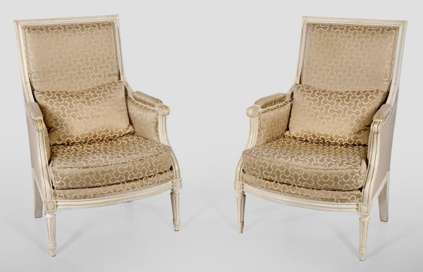 A pair of French ivory coloured Louis XVI style easy chairs.