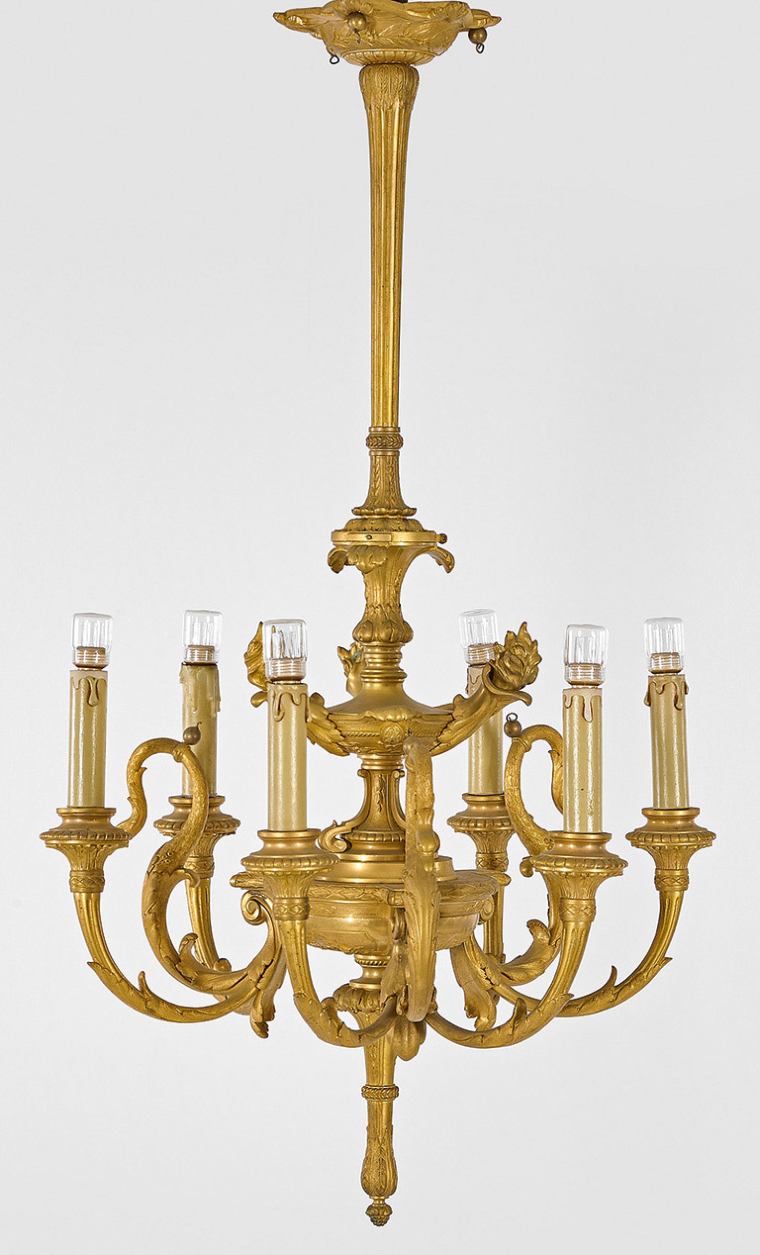 6-flg.; Bronze, vergoldet. Mehrfach gegliederter Balusterschaft mit Fackelmotiven. Davon ausgehend stark geschwungene, paarweise angeordnete Leuchterarme sowie mittig je ein gestreckter Schwanenhals. Zylinderförmige Tüllen. Elektrifiziert. H. 90 cm. D. 45 cm.