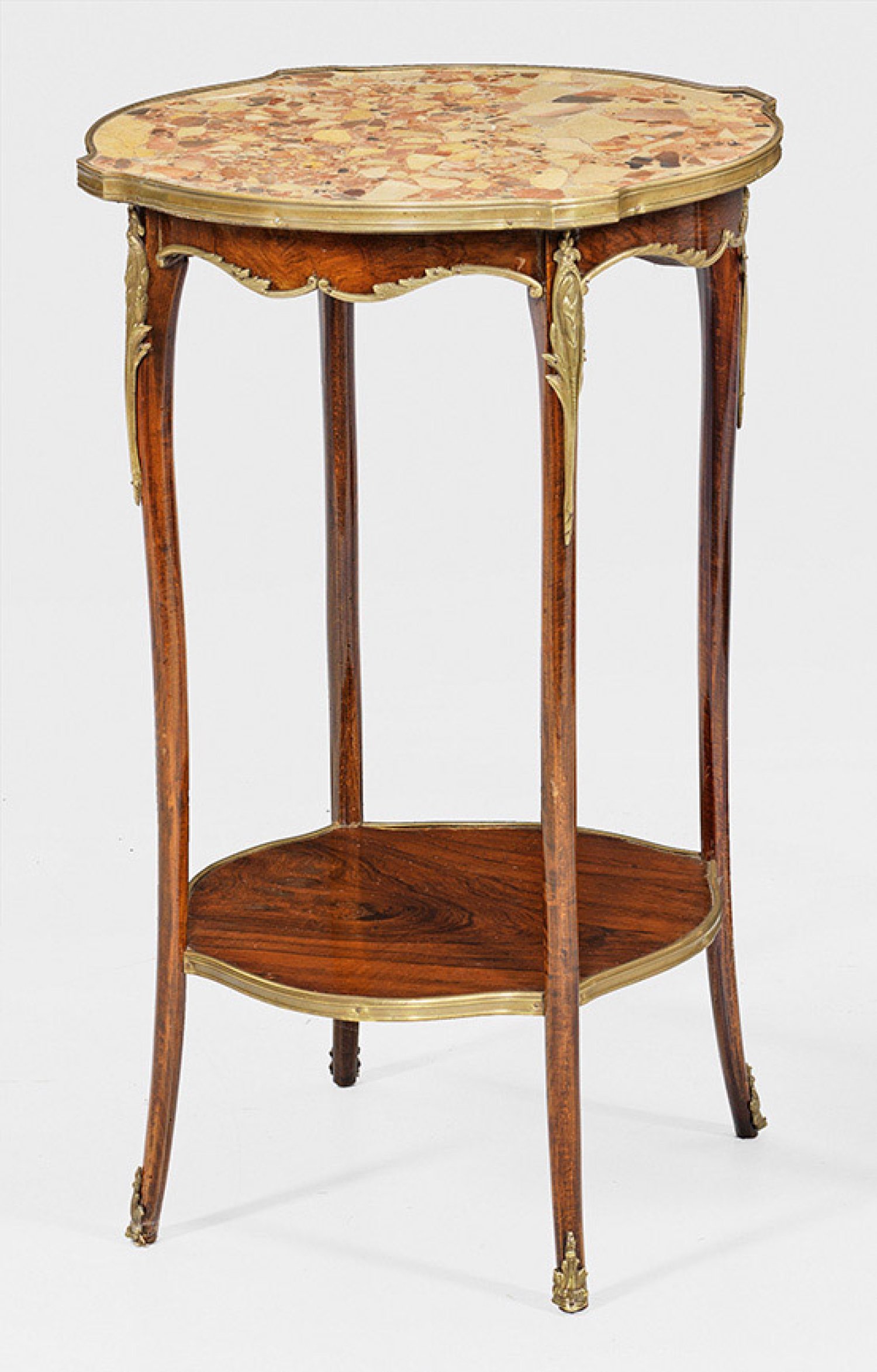 Palisander, furniert. Bombierte Zarge, auf hohen, leicht geschweiften Beinen, unterhalb durch Ablagefach verbunden. Profilgerahmte Deckplatte aus beigefarbenem, roséfarben, gelb und grau gemasertem Marmor. Applikationen aus Bronze. H. 74,5 cm. D. 48 cm.