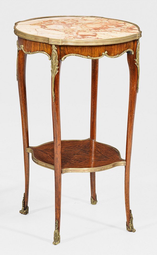 Palisander, furniert. Bombierte Zarge, auf hohen, leicht geschweiften Beinen, unterhalb durch Ablagefach verbunden. Profilgerahmte Deckplatte aus roséfarben gemasertem Marmor, unw. rest.; Applikationen aus Bronze. H. 73 cm. D. 45 cm.