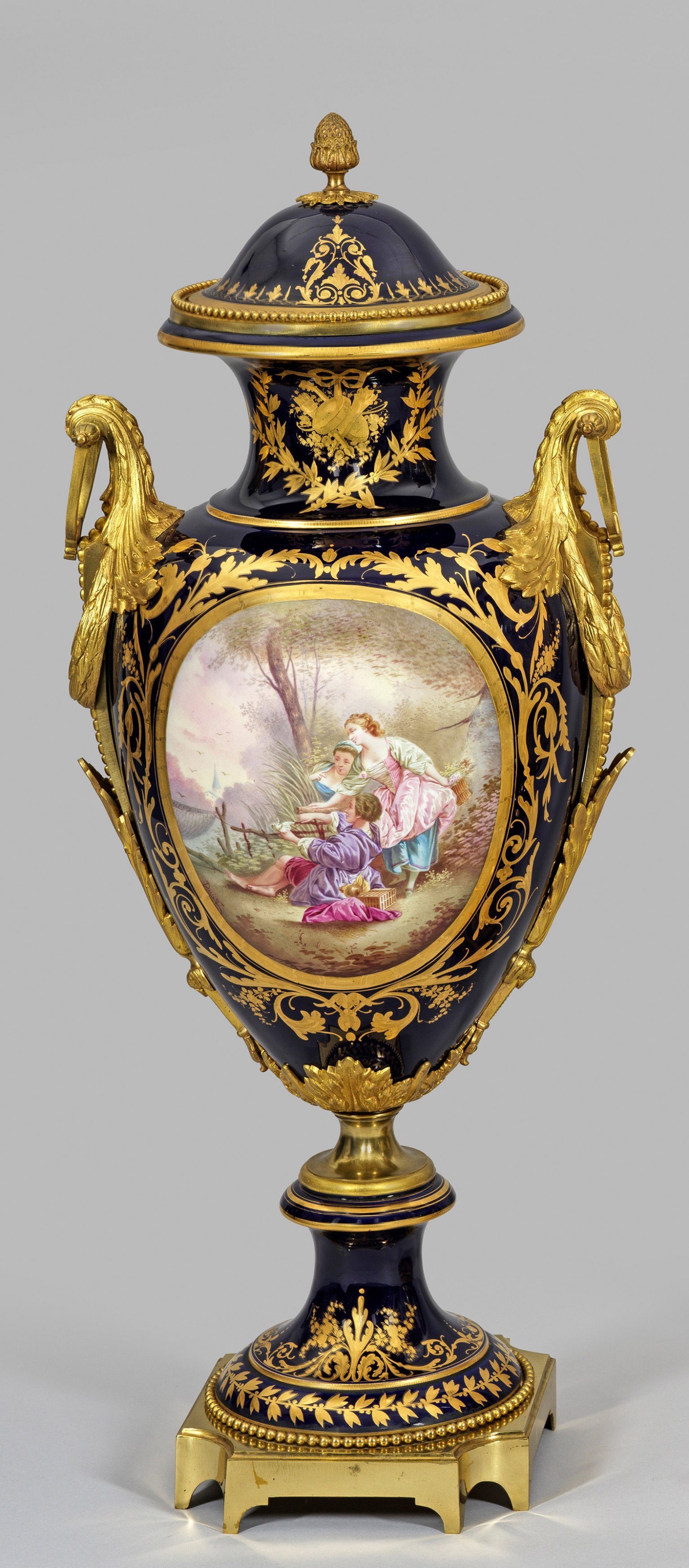 Porzellan mit kobaltblauem Fond, teilw. polychrom bemalt. Messing vergoldet. Über flachem Podestsockel balusterförmiger Korpus, flankiert von plastischen Volutenhenkeln. Schauseitig auf der Wandung von goldradierten Voluten gerahmtes Tondo mit Watteauszene. Rücks. Landschaftsdarstellung. H. 92 cm.