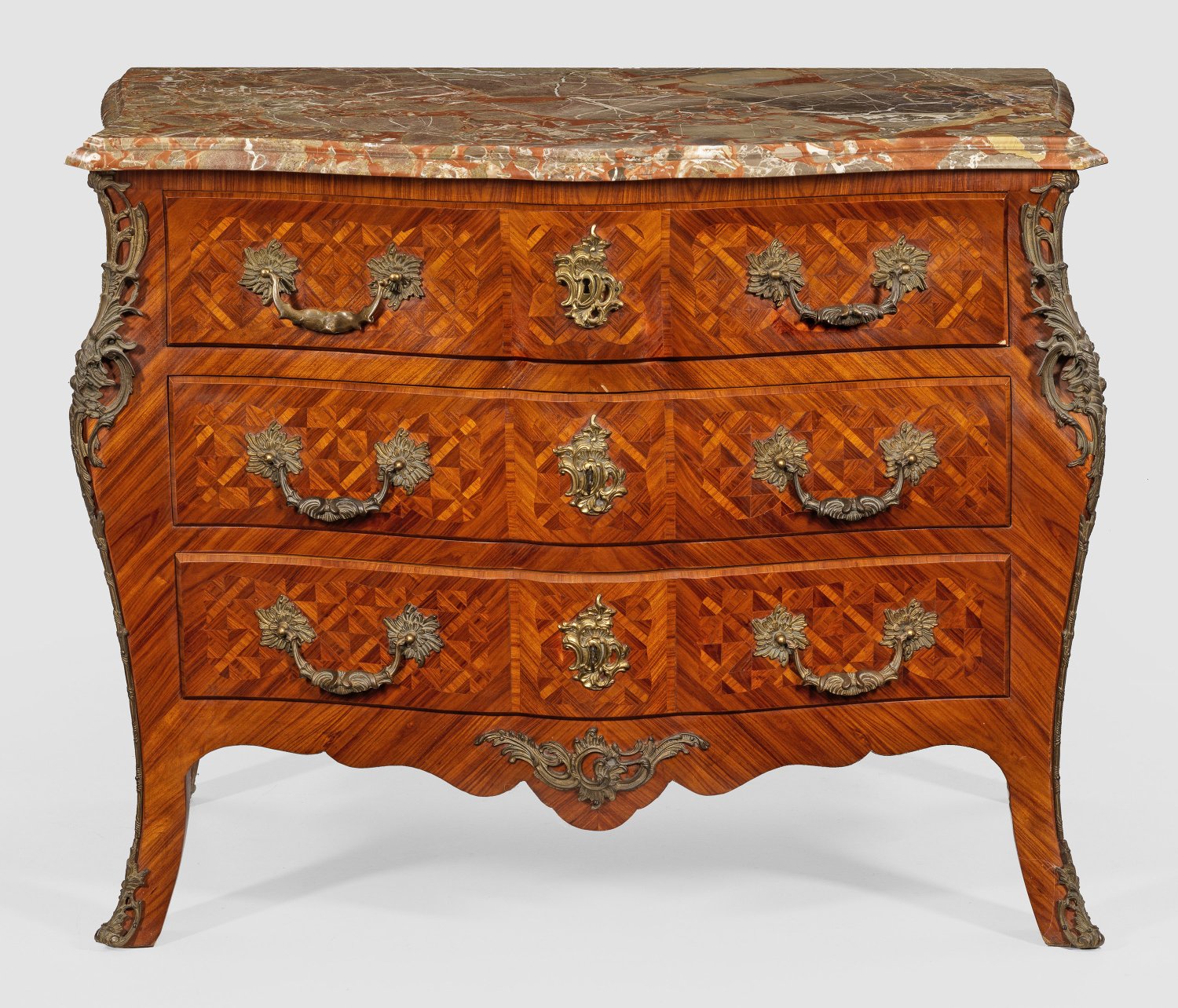 Rosenholz, furniert. Dreiseitig bombierter Korpus, flankiert von schmalen Ecklisenen, in ausgestellte Beine übergehend. In der gegliederten Front drei breite Schubladen. Flächendeckend breit gerahmte Furnierfelder aus Rautenmarketerie. Profilierte Deckplatte aus orangefarben und grau gemasertem Marmor. H. 88 cm. 111 cm x 55 cm.