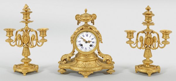 3-tlg.; Bronze, vergoldet. Rundes Uhrengehäuse auf geschweift ansteigendem Sockel mit Puttenfries, flankiert von Blattvoluten. Vasenbekrönung und weißes Emailzifferblatt. Pendulenwerk mit Pendelfeder sowie Halbstundenschlag auf Glocke. Platine bez. Japy Fères. Dazu Leuchterpaar, 2-flg.; Balusterschaft mit stark geschwungenen Leuchterarmen. Uhren-H. 27 cm. Leuchter-H. 29 cm.