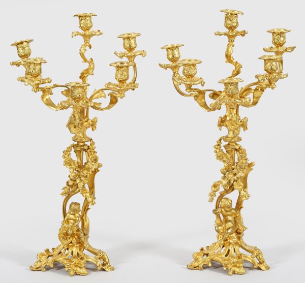 Gegenstücke. 6-flg.; Bronze, vergoldet. Über durchbrochen gearbeiteter Basis vollplastische Puttenkinder sowie korrespondierender, offen gestalteter Schaft mit üppigen Blüten. Oberhalb davon ausgehend stark geschwungene Leuchterarme mit vasenförmigen Tüllen. H. 56,5 cm.