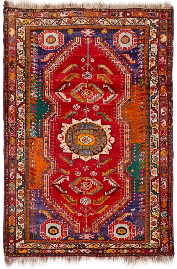 Persien. Wolle auf Ziegenhaar. Auf violett-, grün- und orangefarbenem Fond große, rotgrundige Reserve mit Ovalmedaillon und Zackenblättern. Umlaufend mehrteilige Bordüre. 145 cm x 102 cm.