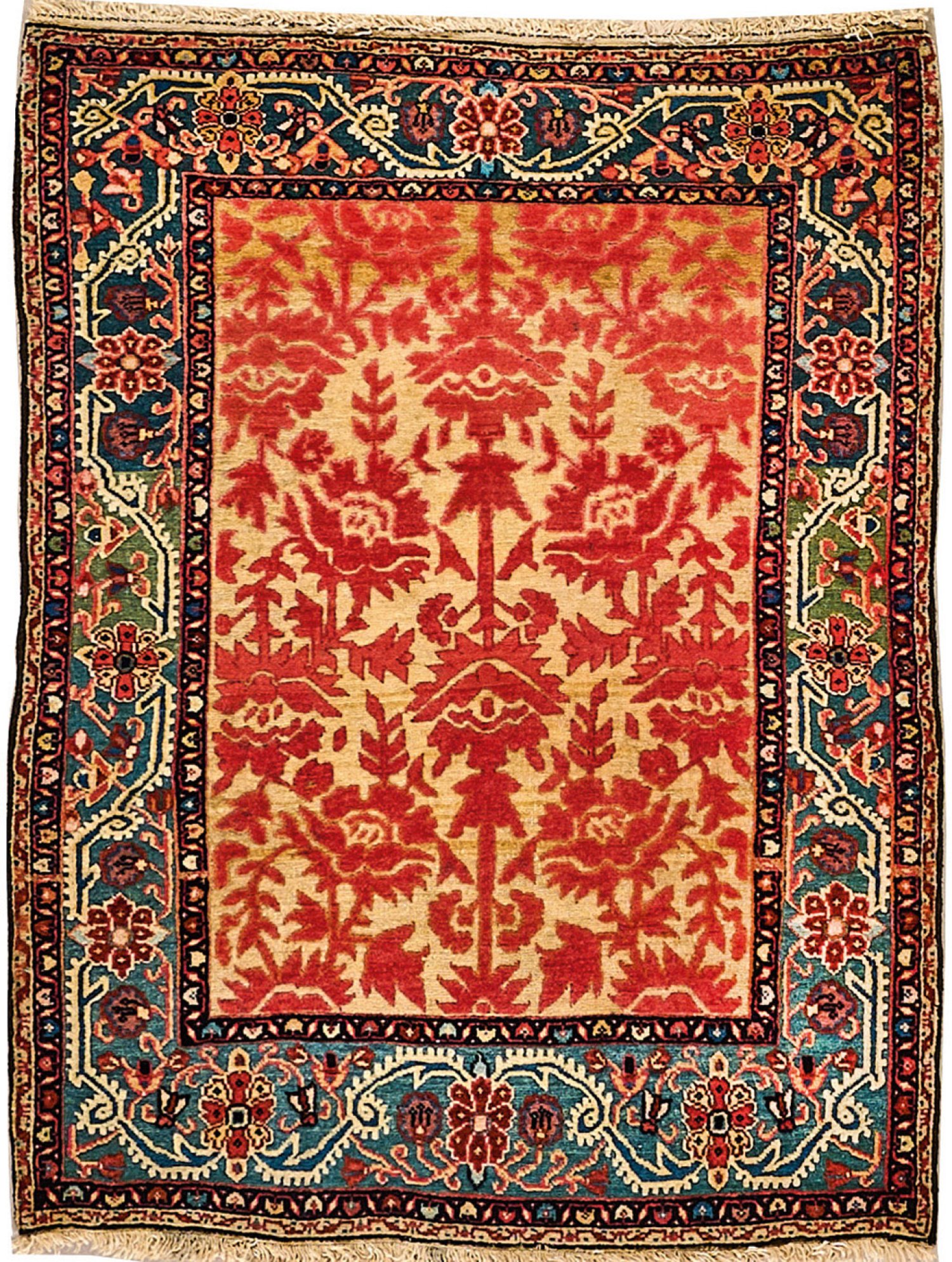 Persien. 19. Jh.; Wolle auf Baumwolle. Flächendeckendes Reliefmuster. Auf beigefarbenem, leicht abraschiertem Fond orangerote, durchlaufende Musterung und stilisierte Blüten. Umlaufend breite, blaugrüne Bordüre aus Wellenband und Blütenrosetten. 80 cm x 62 cm.